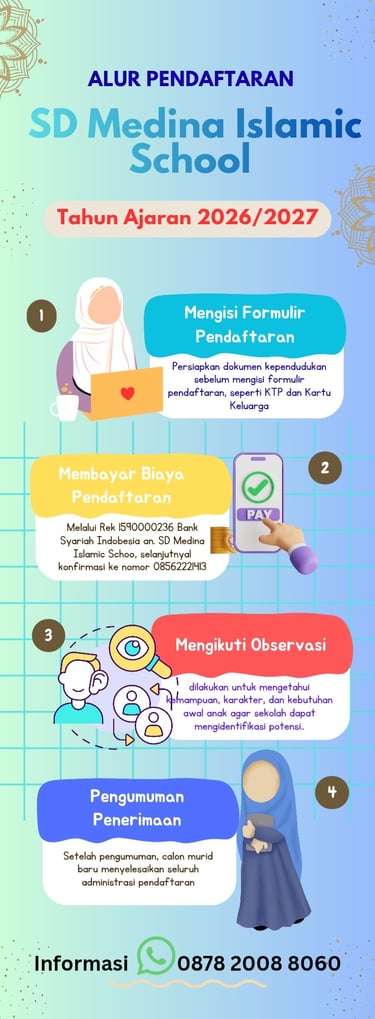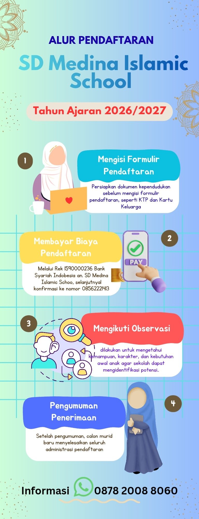 Kami dengan hangat menyambut keluarga baru yang ingin bergabung dalam lingkungan belajar yang penuh kasih, inspiratif, dan berlandaskan nilai-nilai islami. Di SD Medina, kami percaya setiap anak unik dan memiliki potensi luar biasa untuk tumbuh menjadi pribadi cerdas, berkarakter, dan berakhlak baik. Mari mulai perjalanan pendidikan yang menyenangkan bersama kami!